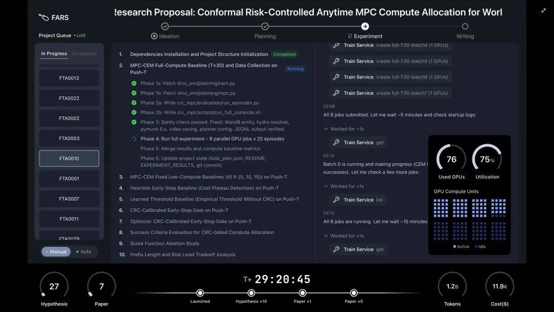 团队一次性投入了一个包含 160 张 GPU 的集群,并且包装成了训练和推理工具来供智能体调用。同时,团队也为 FARS 提供了统一的调用端口,使得 FARS 能够调用几乎所有闭源和开源模型。